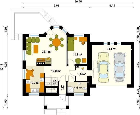 Характеристика проекта Szafran. Проект классических пропорций компактной формы, который оснащен набором энергосберегающих решений, направленных на снижение затрат на техническое обслуживание дома. На первом этаже просторная гостиная, закрытая кухня, ...