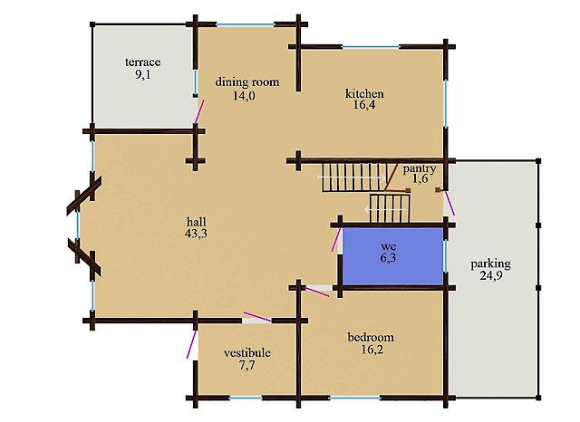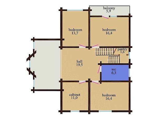 |  | Деревянный дом "Мексика" из оцилиндрованного бревна на земельном участке под Минском    проект 194 м² 00.00.0000  Дом из оцилиндрованного круглого бревна на земельном участке под Минском — элитный проект 194 м² Проект элитного дома из оцилиндрованного бревна с баней и парковкой для автомобиля разрабатывался в соответствии с запросами взыскательных потребителей. Здесь есть все, что необходимо для создания полноценного комфортного проживания. Вместительный, уютный загородный деревянный дом из сухого бревна, для дружного семейства. Представленной планировкой дома, архитектор воплотил замысел практичного и эстетичного жилища. На первом этаже дома, располагается просторная гостиная.   Её близкое расположение к выходам на улицу, примыкание к столовой, кухне и санузлу без коридоров делает перемещение отдыхающих по "стратегическим пунктам" максимально быстрым, а пребывание в зоне отдыха - максимально комфортным. На 194 м² общей площади размещаются жилые и вспомогательные комнаты, помещения. Попасть в дом с парковки можно через кладовую, которая граничит с лестницей, ведущей на второй этаж или через парадное крыльцо. Второй этаж представлен холлом, санузлом и четырьмя комнатами, которые можно использовать как спальни, детские или организовать в некоторых из них рабочее пространство для кабинета, библиотеки или тренажерного зала. Для любителей трапезы на свежем воздухе приятным дополнением к плану дома станет терраса.